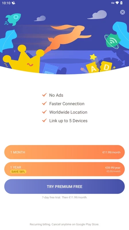Turbo VPN jest dostępny za darmo i umożliwia użytkownikom anonimowy dostęp do zablokowanych witryn oraz korzystanie z ograniczeń międzyregionalnych. Poziom bezpieczeństwa na poziomie wojskowym zapewnia stabilne, szybkie i niezawodne połączenie internetowe, nawet w wersji darmowej. Jeśli jednak zależy Ci na czymś więcej, musisz przejść na wersję premium. Oferuje ona wiele zaawansowanych funkcji, takich jak brak reklam, dzielone tunelowanie, dedykowane adresy IP itp. Plany cenowe obejmują okres jednego miesiąca, sześciu miesięcy i roku. Możesz również skorzystać z jednej subskrypcji na maksymalnie pięć urządzeń.